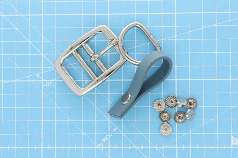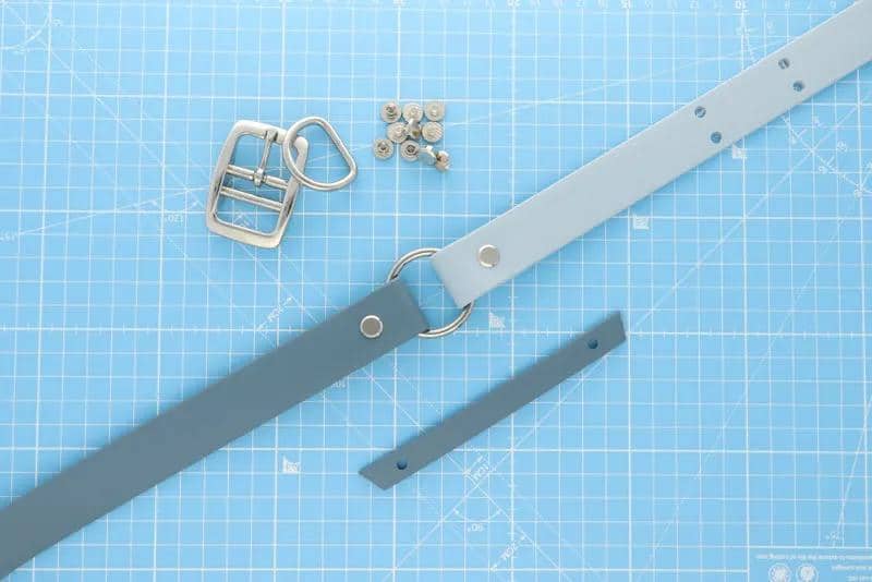 Faites d'abord glisser l'anneau en D sur le BioThane, puis la boucle décorative réalisée et enfin la boucle de ceinture. Vous allez maintenant les fixer avec les vis chicago. Assurez-vous que la boucle décorative pointe avec le côté lisse de la vis vers l'extérieur.