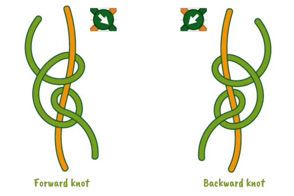 Il existe quatre nœuds de base que vous pouvez utiliser pour réaliser presque tous les modèles de bracelets d'amitié. Pour ce modèle en particulier, vous n'avez besoin que de deux d'entre eux : le nœud avant et le nœud arrière. Le nœud avant va de gauche à droite et le nœud arrière va de droite à gauche. Si la flèche du motif pointe vers la droite, vous faites un nœud en avant. Si la flèche du modèle pointe vers la gauche, vous faites un nœud en arrière.