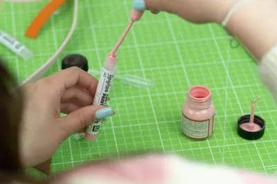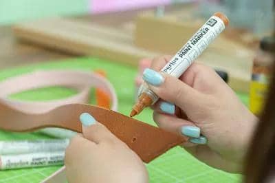 Remplissez vos marqueurs avec les couleurs amusantes de la peinture pour cuir Angelus et écrivez ou dessinez des figures sur le cuir. La peinture pour cuir Angelus peut être épaisse. Par conséquent, diluez la peinture pour cuir avec le produit Angelus 2-Thin 29.5 mldans un rapport de 1:1.
