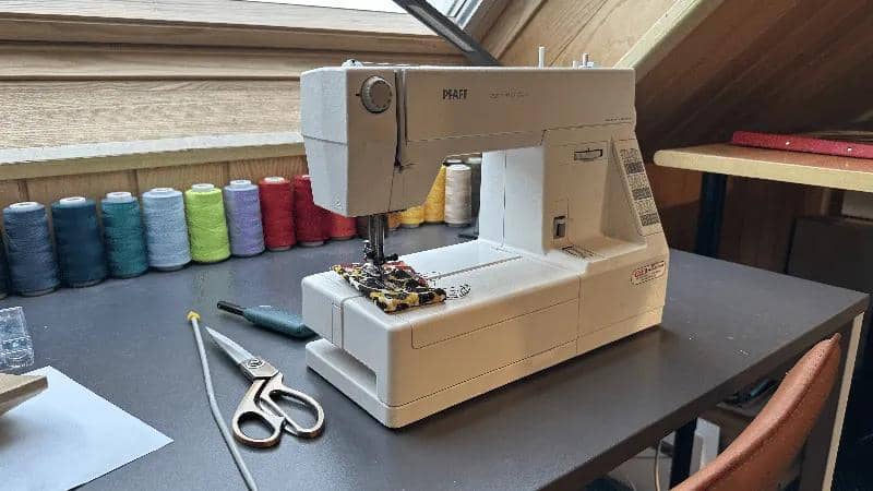 Une machine à coudre est posée sur une table sous la lucarne. "Ceci est l'ancienne machine à coudre de ma mère", explique Louise. "Elle a au moins 30 ans et fonctionne encore très bien. Je voudrais le lui rendre, je ne supporterais pas qu'elle lache pendant que je l'utilise. J'envisage d'acheter une machine à coudre industrielle, mais c'est un investissement important".