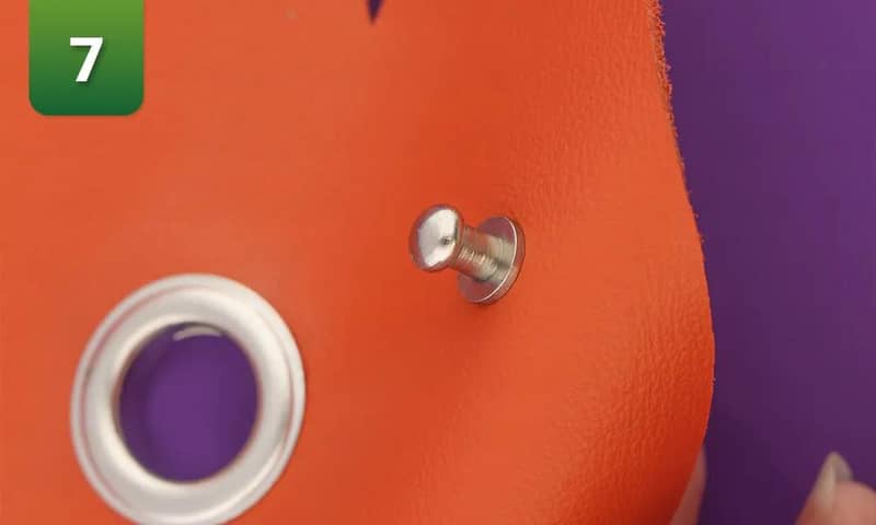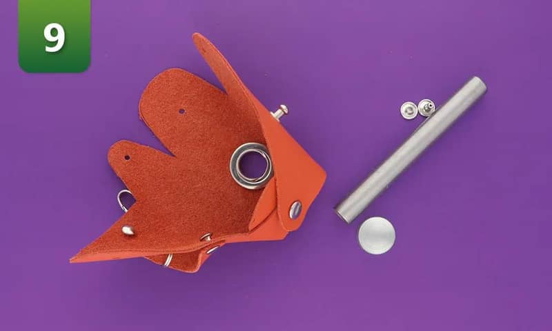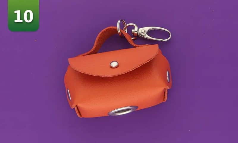 8. Fixez la poignée avec deux rivets. Pour ce faire, vous pouvez utiliser une poinçon ou un presse d'établi manuelle. Le cuir nappa utilisé ici ayant une épaisseur de 1,2 mm, les deux couches sont fixées l'une à l'autre par des rivets de 7 mm.9. Repliez les 3 rabats latéraux l'un sur l'autre et fixez les a l'aide d'un rivet. Faites de même de l'autre côté. Veillez à conserver le même ordre de pliage des deux côtés. Utilisez des rivets de 9 mm pour fixer les trois couches de ce cuir de 1,2 mm d'épaissur.10. Placez votre rouleau de sacs à crottes dans le support, fermez le rabat et attachez le sac à la laisse.