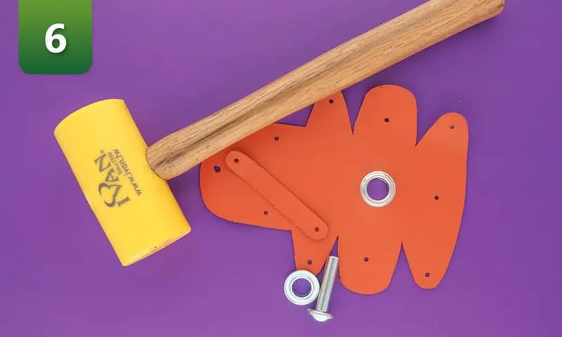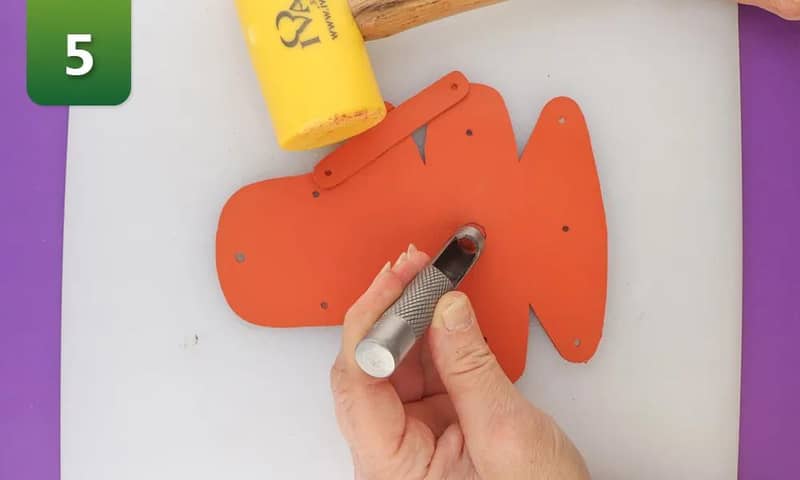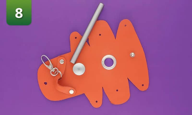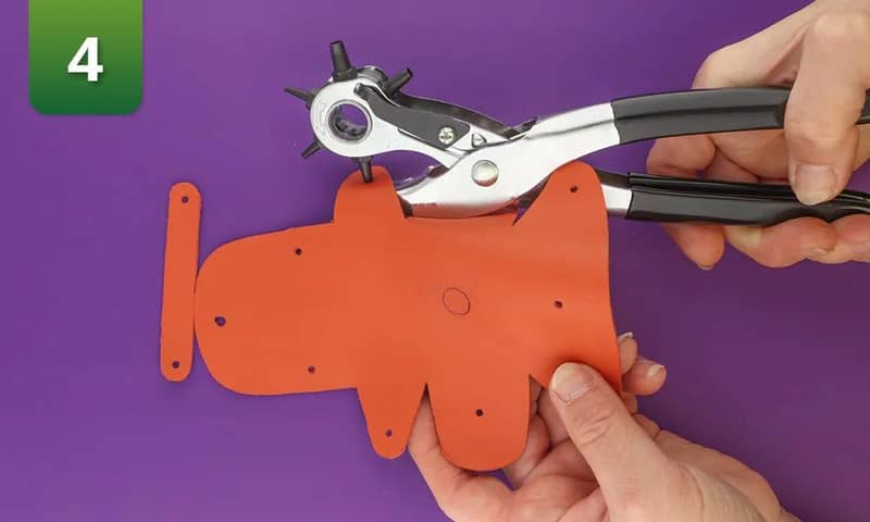 1. Découpez le patron PDF.2. Placez le deux pièces de patron découpées sur le cuir et retracezles à l'aide d'un stylo. Appuyez sur le papier avec le stylo pour marquer les emplacements des trous.3. Découpez le cuir. Vous avez maintenant deux morceaux de cuir : le morceau pour le support lui-même et une partie pour la poignée.4. Perforez les trous aux endroits que vous avez marqués. Tous les trous ont une taille de 3 mm, à l'exception du trou situé au milieu du rabat du porte-sac à crotte. Le trou dans le rabat doit avoir une taille d'environ 4 mm. 5. Faites le trou pour l'œillet. Si vous n'avez pas d'outil pour cela, vous pouvez aussi le découper avec des ciseaux. Vous n'utilisez pas d'œillet ? Dans ce cas, vous pouvez choisir de faire une découpe de 2,5 cm au lieu d'un trou.6. Placez une partie de l'œillet de chaque côté du cuir et fixez-le à l'aide de la pince à œillets. Vous n'avez pas d'œillet ni d'outil de fixation à la maison ? Dans ce cas, vous pouvez également omettre l'œillet.7. Vissez le bouton de fermeture. Ce bouton servira à fermer le portesac à crottes.