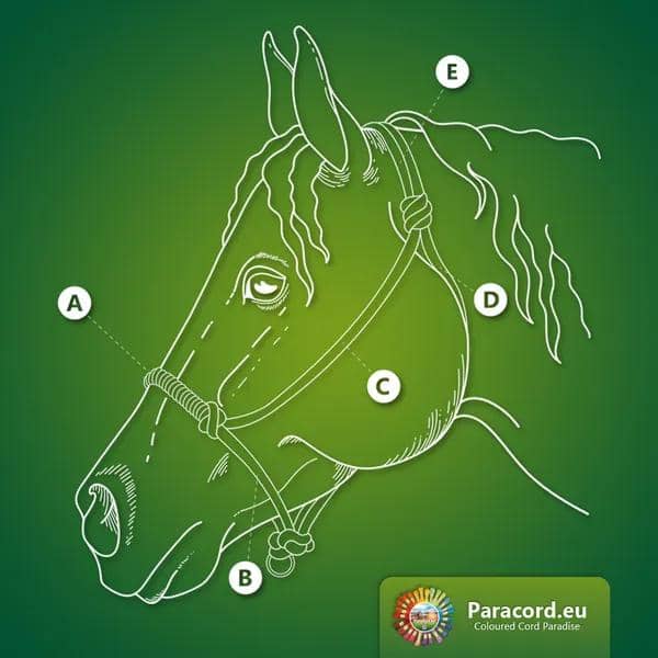 Les lettres A, B, C, D et E du tableau renvoient aux parties du licol. L'illustration montre de quelles parties il s'agit.