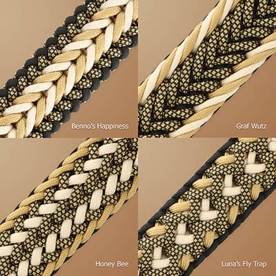 Avec ce kit, vous pouvez réaliser ces nœuds, parmi d'autres : Honey Bee, Benno's Happiness, Luna's Fly Trap et Graf Wutz. Avec ce matériel, vous pouvez également faire toutes sortes d'autres nœuds, mais pour les 4 nœuds mentionnés, des tutoriels sont disponibles.